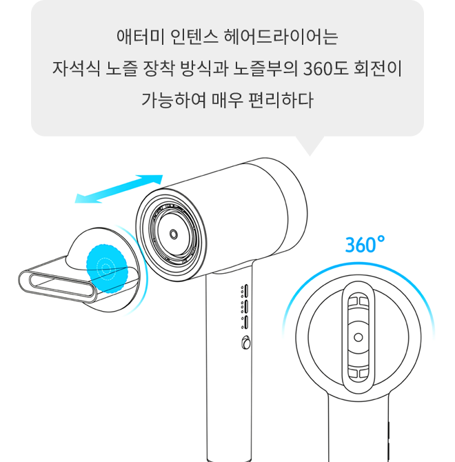 또 ‘애터미 인텐스 헤어드라이어’는 세 가지 타입의 스무딩 노즐, 스타일링 노즐, 디퓨저 노즐로 교체하여 원하는 스타일링을 할 수 있는데, 이는 자석으로 쉽게 탈부착이 가능하다. 스무딩 노즐은 넓은 입구로 부드러운 바람이 나와 빠른 헤어 건조에 적합하며, 스타일링 노즐은 좁은 입구로 빠른 기류를 형성해 부분적인 스타일링에 도움을 준다.